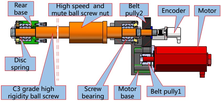 За вращение ШВП по оси X отвечает сервомотор через зубчатый ремень — так обеспечивается высокая жесткость гайки и гарантируется максимальная эффективность крутящего момента. Дисковая пружина на задней опоре снижает термические деформации винта при росте температуры, за счет чего достигается стабильность при длительной обработке.