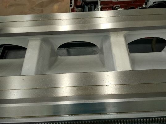 Цельнолитая станина усилена ребрами жесткости. Применение широких направляющих позволяет обрабатывать тяжелые заготовки и делать съем до 5 мм на сторону без потери точности и качества получаемого изделия.