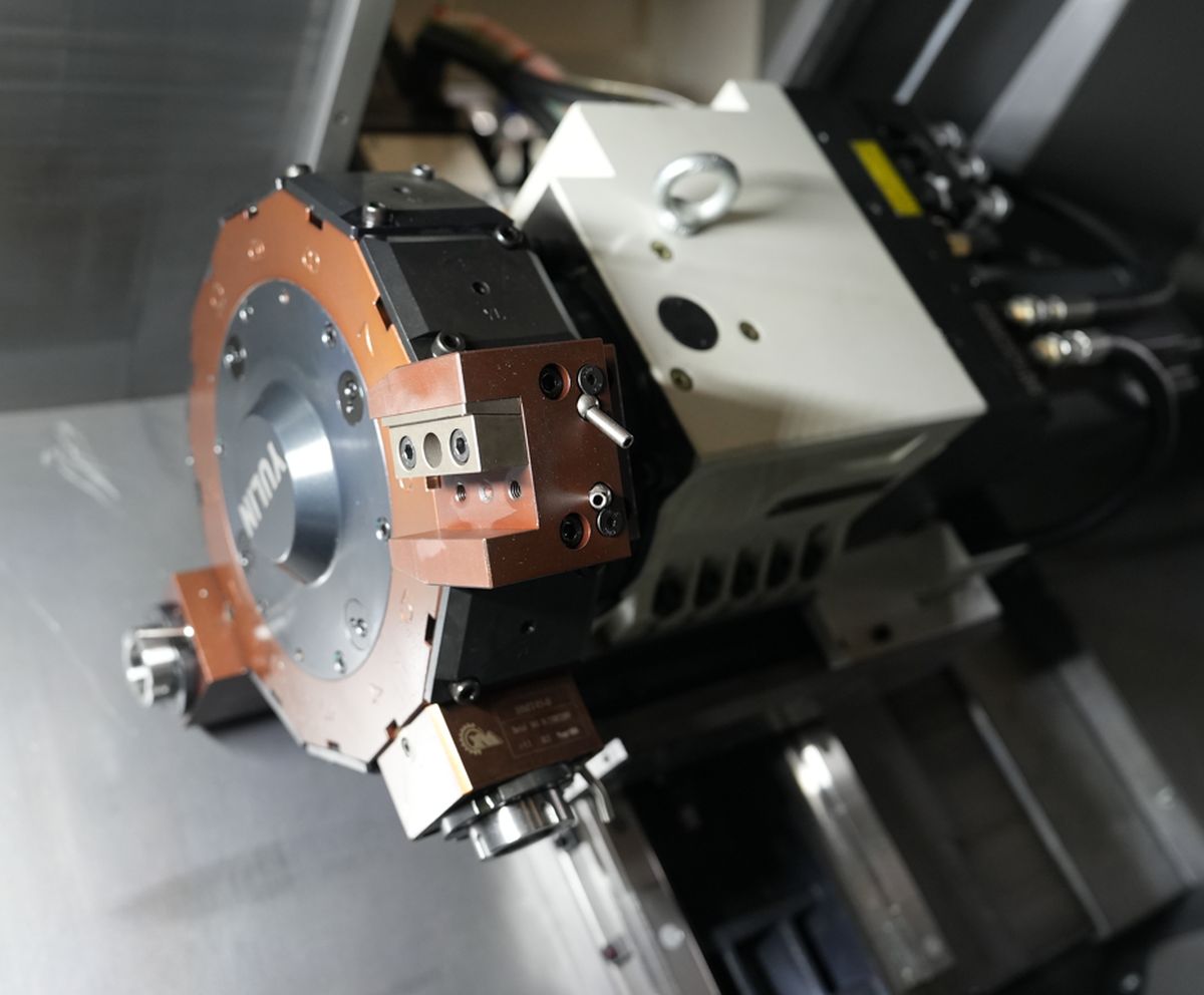 Используется высокоточный шпиндель, с осью С. Гидравлический тормоз шпинделя обеспечивает плавное движение и жёсткую фиксацию детали при обработке фрезерованием. Обороты – 4500 об/мин.