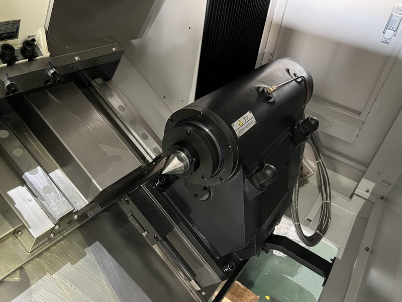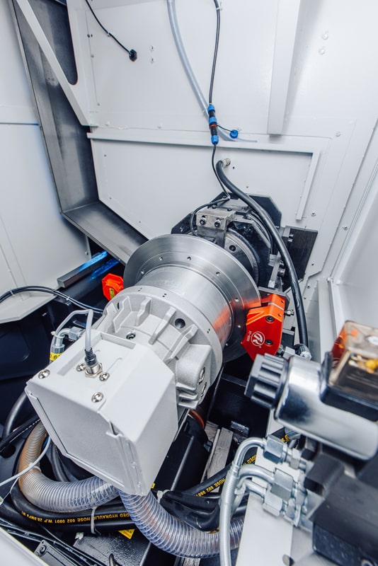 На токарном центре KTL установлен главный двигатель повышенной мощности производства Fanuc (Япония) . Передача крутящего момента с основного двигателя на шпиндель осуществляется за счет клино-ременной передачи, что значительно уменьшает шум при работе. Скорость вращения шпинделя регулируется бесступенчато, что обеспечивает высокую точность и шероховатость обработки. Станок оснащен шпинделем с полым гидроцилиндром для обработки прутков до Ø 75 мм производства Chandox (Тайвань).