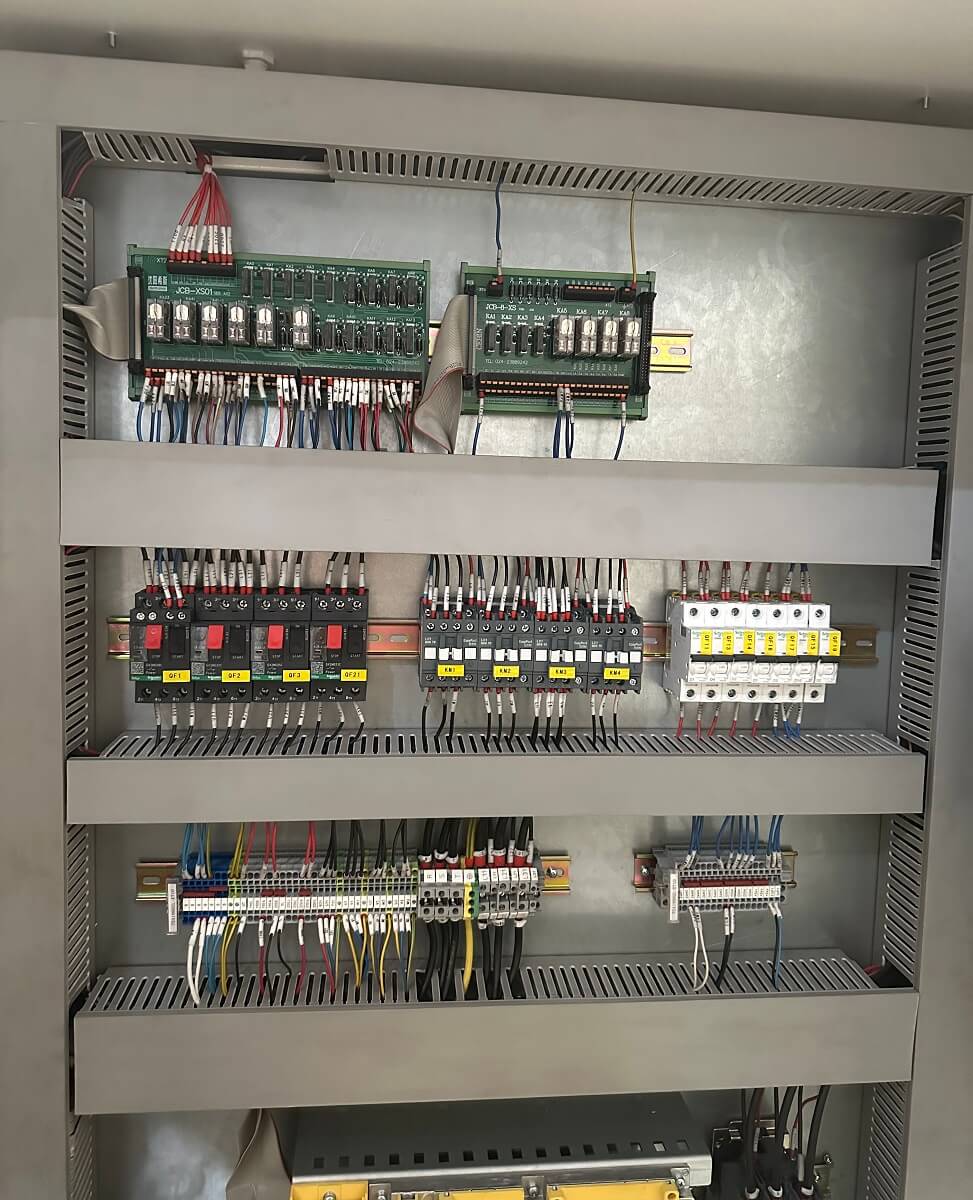 Электрошкаф полностью соответствует нормам СЕ, что указывает на соответствие продукции всем необходимым требованиям законодательства Европейского Союза. Основные компоненты установленной электроники принадлежат компании Fanuc и Siemens.