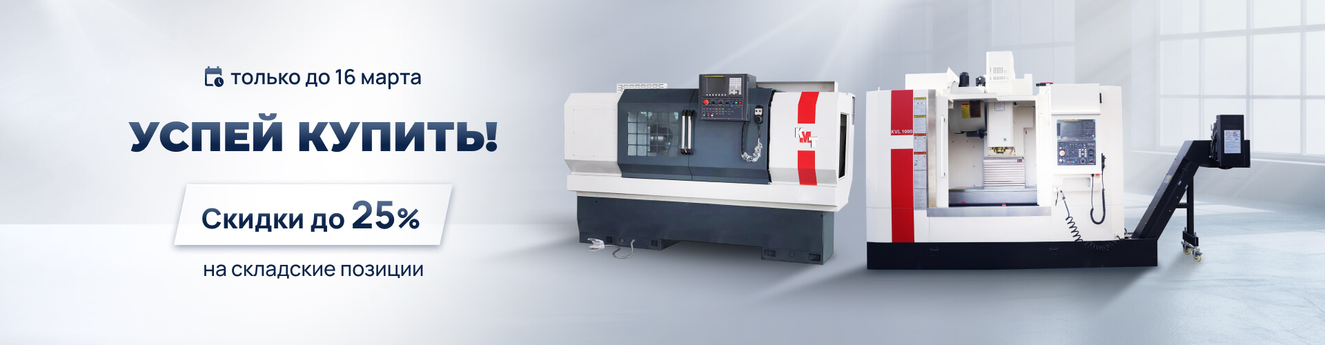 Скидки до 25% на горизонтальные, токарные, вертикальные фрезерные станки и обрабатывающие центры! Выгодное предложение для металоообработчиков — воспользуйтесь до 16 марта.